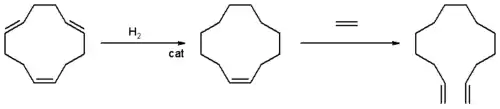In another olefin application of Shell cyclododecatriene is partially hydrogenated to cyclododecene and then subjected to ethenolysis to the terminal linear open-chain diene. The process was still in use at Essar Stanlow refinery until a serious explosion and following fire lead to the closure of the plant and the alcohols units it fed in 2018.