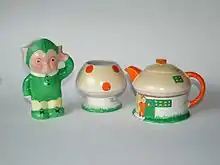 In 1926 Shelley introduced a second well known illustrator – Mabel Lucie Attwell. Her first six designs portrayed scenes involving children, animals and small green elves in green suits – these were called 'Boo Boos'. Attwell also produced a tea set, the teapot was in the shape of a mushroom house, the sugar bowl was a mushroom with the top cut off and the milk jug was a green Boo Boo in a coy saluting pose.