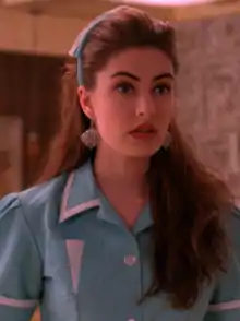 Shelly Johnson (née McCauley, later known as Shelly Briggs),[1] is a fictional character in the Twin Peaks franchise. She was created by the series creators Mark Frost and David Lynch and portrayed by Mädchen Amick.[3][4] She is a main character in the original series, and has a supporting role in the prequel films Twin Peaks: Fire Walk with Me (1992) and Twin Peaks: The Missing Pieces (2014). Shelly returns in the 2017 revival series.[5][6][7][8] In the original series, Shelly dropped out of high school to marry the trucker Leo Johnson, who began to abuse her after their marriage. Shelly works as a waitress at the Double R Diner and has an affair with Bobby Briggs. In Twin Peaks: The Return, it is revealed that Shelly married Bobby and still works at the Double R Diner. Her main storyline focuses on her trying to save their troubled daughter, Becky Burnett, from her own marriage to an abusive drug addict.