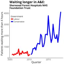 In October 2013 the Trust had been put into the highest risk category by the Care Quality Commission.[8] In October 2015 a further CQC report showed deterioration. Only one of 18 high-level action points had been completed and it was rated inadequate for safety, effectiveness and being well-led. There were 54 serious incidents between March 2014 and February 2015 and 88 patients died of "unspecified septicaemia".[9]