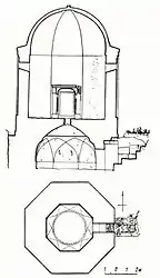 The mausoleum is octahedral and the widths of the edges are 3 meters. The mausoleum is covered with an octahedral spherical cupola made of thin stone plates. Material is drafted stone (limestone).[1]
