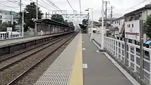 This station consists of two ground-level opposed side platforms serving two tracks, connected to the station building by an underground passage.