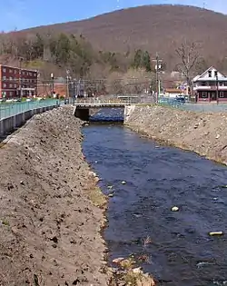 A turnpike was built through the Shickshinny Creek gap in 1877.[18] A number of bridges have been constructed over the creek. A masonry arch bridge carrying Glen Ave over the creek is 32.2 feet (9.8 m) long. A concrete tee beam bridge carrying Pennsylvania Route 239 over the creek was constructed in 1925. It is 33.1 feet (10.1 m) long and is situated in Union Township.[19] A steel stringer/multi-beam or girder bridge was built over the creek in 1930 and renovated in the 2010s.[19][20] It is 46.9 feet (14.3 m) long and carries Bartoli Lane. A bridge of the same type, but carrying State Route 4007, was built in Union Township in 1940. This bridge is 51.8 feet (15.8 m) long. A concrete tee beam bridge carrying that road over the creek was built in 1965. It is 35.1 feet (10.7 m) long and is also situated in Union Township.[19]