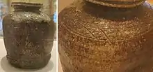 This ware has a mark of three (san) lines on two places of the shoulder, that which is smoothed horizontally in a random manner. The lower body is scraped vertically and has an untrimmed edge. It has a light-gray core with an unglazed pinkish-beige surface.