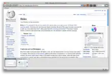 The features of Shiira include appearance options. Users may switch between Aqua or Metal styles in addition to changing the buttons' appearances. However, in the current 2.0 release, changes in themes are, as yet, not available. Tabs are also customizable. Another option is "Tab Exposé", which acts much like the Exposé feature of Mac OS X; each tab is visible in its totality, enabling users to select the tab to which they wish to navigate.[2] The 1.x releases of Shiira also have a page-turning effect for transitions between any two webpages; however, this was dropped from 2.x releases. The new interface in Shiira 2.0 can be set to display tabs as thumbnails along the bottom or sides of the window.[3]