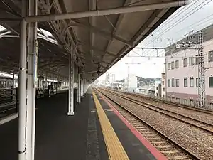 Shimonoseki Station (下関駅, Shimonoseki-eki) is a railway station on the Sanyo Main Line, operated by West Japan Railway Company (JR West) in Shimonoseki, Yamaguchi, Japan. Kyushu Railway Company (JR Kyushu) and Japan Freight Railway Company (JR Freight) services also use this station. The company boundary between JR West and JR Kyushu is at the west end of this station where there is an entrance signal from Moji.