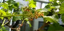 Shine Muscat is a diploid table grape cultivar resulted from a cross of Akitsu-21 and 'Hakunan' (V. vinifera) made by National Institute of Fruit Tree Science (NIFTS) in Japan in 1988. It has large yellow-green berries, crisp flesh texture, muscat flavor, high soluble solids concentration and low acidity.[1][2] Nomenclature registration number is "Grape Agriculture and Forestry No. 21"「ぶどう農林21号」.[3]