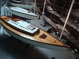 The floor area is used to display large ship elements such as the keel and fragment of side of The Copper Ship (Miedziowiec). The exhibition is completed by three historical yachts: Opty (yacht of Leonid Teliga, the first Pole to single-handedly circumnavigate the globe), Dal (on which Andrzej Bohomolec, Jerzy Świechowski and Jan Witkowski were the first Poles to sail across the Atlantic) and Kumka IV – a pioneering construction by Tadeusz Sołtyk, one of the first welded yachts.[6]