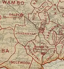 On 19 March 1949, the Shire of Drayton was abolished on 19 March 1949, split between City of Toowoomba and the Shires of Cambooya, Gatton and Jondaryan.[2][4]