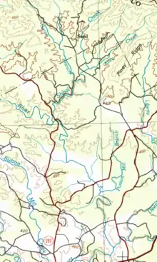 Shoal Creek rises in northern Habersham County, Georgia, south of Lake Rabun, and runs in a southerly direction for approximately 2.6 miles, before it joins with Alley Creek, coming from its east.[2] Just under a mile further on, Shoal Creek picks up Nerve Branch, and continues southward for 1.3 miles to cross State Route 197, just before flowing into the Soque River west of the highway.[3]