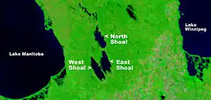 The Shoal Lakes are lakes located in the southern Interlake region of Manitoba in Canada between Lake Winnipeg and Lake Manitoba. They refer to North Shoal Lake, West Shoal Lake, and East Shoal Lake.[1] The surrounding territory is generally cattle pasture, with some rocky areas. Because of the flat nature of the surrounding terrain, small fluctuations in water level significantly affect the local habitat. The lakes are a significant location for migrating and nesting waterfowl.[2]