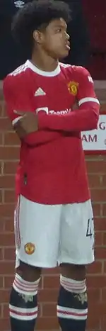 As a child, Shoretire played with Whitley Bay Boys Club, Newcastle City Juniors, Wallsend Boys Club, Hebburn Town and Cramlington Juniors.[3] He was also briefly part of Manchester City's youth setup but left to join rivals Manchester United at the age of nine.[3][4] He quickly rose through the youth ranks, frequently playing a year up. In December 2018, he became the youngest ever player to appear in the UEFA Youth League at the age of 14 years and 314 days.[5] In 2020, after impressing with the under-18s, Neil Wood, coach of the under-23s, handed him his under-23s debut when he was just 16. He scored a hat-trick in a 6–4 win for the under-23s against Blackburn Rovers in February 2021.