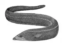 The shortdorsal cutthroat eel (Synaphobranchus brevidorsalis, also known commonly as the shortfin cut-throat eel[2]) is an eel in the family Synaphobranchidae (cutthroat eels).[3] It was described by Albert Günther in 1887.[4] It is a marine, deep water-dwelling eel which is known from the Indo-Pacific and western central Atlantic Ocean, including Zanzibar, Maldives, Australia, Japan, Suriname, and the Gulf of Mexico. It dwells at a depth range of 900 to 3,000 metres (3,000 to 9,800 ft), most often between 1,000 to 2,500 metres (3,300 to 8,200 ft), and leads a benthic lifestyle, inhabiting the continental slope. Males can reach a maximum total length of 111 centimetres (44 in).[3]