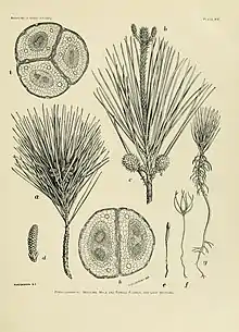 The leaves are needle-like, in fascicles (bundles) of two and three mixed together, and from 7–11 cm (2+3⁄4–4+1⁄4 in) long. The cones are 4–7 cm (1+1⁄2–2+3⁄4 in) long, with thin scales with a transverse keel and a short prickle. They open at maturity but are persistent.[6] Shortleaf pine seedlings develop a persistent J-shaped crook near the ground surface.[7] Axillary and other buds form near the crook and initiate growth if the upper stem is killed by fire or is severed. It frequently hybridizes naturally with loblolly pine and pitch pine where their ranges intersect. Hybridization with loblolly pine has become increasingly frequent in recent decades and results in a loss of fire tolerance.[8]