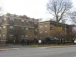 Shortridge–Meridian Street Apartments Historic District is a national historic district located at Indianapolis, Indiana. The district encompasses 136 contributing buildings in a predominantly residential section of Indianapolis. It was developed between about 1900 and 1951, and includes representative examples of Colonial Revival, Classical Revival, Late Gothic Revival, Mission Revival, Renaissance Revival, Bungalow / American Craftsman, and Art Deco style architecture. Located in the district is the separately listed Shortridge High School. Other notable buildings include the Vernon Court Apartments (1928), Fronenac Apartments (1951), Biltmore Apartments (1927), Meridian Apartments (1929), New Yorker Apartments (1917), Howland Manor (1929), Powell-Evans House (1911), Harms House (1906), Dorchester Apartments (1921), and Martin Manor Apartments (1916).[2]
