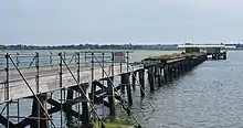 At low water the river is about 0.5 miles (0.80 km) at this point, mudflats extend around 200 yards (180 m) offshore.[5][4] The timber pier extends 540 feet (160 m) offshore to a point where the water is 8 feet (2.4 m).[4] The pier measures 10 feet (3.0 m) wide and has a 40 feet (12 m) wide platform at the end. By 2018 two fishermen's huts were located on the end platform.[6] A second pier to the east is shorter with a transverse arm at its end.[4]