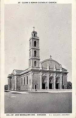 The original church was built to serve the Carmelites and their growing parish of St. Clara, which had been founded in 1894, to serve the majority-German community in Woodlawn following the population boom of the World's Columbian Exposition. Notable architect Henry Schlacks was contracted to design a new church, which is distinctively Renaissance Revival, and cost the equivalent of $7 million dollars when it was finished in 1928.[1][2] With the canonization of Thérèse of Lisieux in 1925, the church also became the site of the National Shrine to Therese of Lisieux.[3]