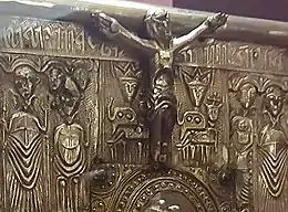On commission from a member of the then dominant Ulster O'Domhnnaill family,[15] the shrine's frontpiece was added in 1534 by the goldsmith Brian O'Morrison. He signed the work with an inscription in Latin, which was translated by the Irish artist, antiquary, archaeologist and collector George Petrie as "Briain ua Muirguissan covered me, anno M.CCCCC.XXXIIII".[16] Moss believes that "covered me" should instead be read as "who enshrines me".[17] O'Morrison added twelve plates (in three arrangements of four different sizes) to the front, with depictions of saints including the crowned Virgin and Child in the smaller inner panels,[18] and St. Bridget, St. Patrick and Colm Cille in four large panels. Located in the upper center of the frontpiece, in the space between the plates, is a relief of the crucified Christ. The front is further decorated by eight large cabochon quartz (rock crystal) gemstones.[13] These semi-precious crystals were in vogue at the time, and probably replaced similar glass stones. Originally the stones may have acted as lapidaries, that is they were chosen and placed based on their symbolic meaning which may have tied in with the text held in the interior chamber.[19]