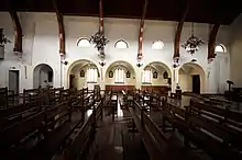 In 1873 the abbess mother Teresa, in private countess Ewa Potocka,[9] dedicated her own money to construction of a new chapel. It was designed by Władysław Kosmowski, an architect involved in a number of religious projects in Warsaw.[10] Made of bricks and replacing the previous wooden construction, the new chapel was outlined as a rather modest building. To deceive the Russian administration the small, 8x17m rectangular one-nave building was covered with a flat roof; main entrance was from an internal yard and a small apse, reaching towards the Żytnia street, was camouflaged wrapped within residential premises.[11] The interior is described as adhering to a neo-Romanesque style, though there is no photographic evidce remaining.[12]
