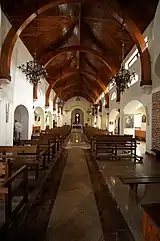 In 1997 Czarnowski was appointed to another religious post; details of his departure from Żytnia are not clear. He was replaced by a new parish priest, Tadeusz Polak, who in agreement with most of the parishioners soon concluded that the church was badly in need of a decisive overhaul.[86] Major works commenced in the early 21st century, this time carried out by professional construction companies. In course of 5 years the walls were strengthened with iron reinforcements, the main nave was extended by 10 meters with a new main porch constructed, a new aisle and a side entry were added along the Eastern wall, red-brick walls were plastered, new windows were fitted and acrylic roof was replaced with a ceramic one. The change was complete when in 2007 the basement was covered with new concrete ceiling and wooden floor gave way to a marble one.[87]