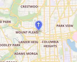 The church is located at 3211 Sacred Heart Way (formerly Pine Street, NW), nestled in between the Mt. Pleasant and Columbia Heights regions of the District of Columbia, just off 16th Street Northwest, for a long time a de facto dividing line in the tensely racially divided Washington in the decades after the city's 1968 riots.