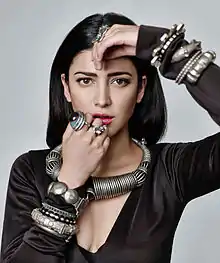 Shruti Haasan is an Indian actress, composer and playback singer who works in Tamil, Telugu, Hindi, Kannada films. Haasan sang her first song aged just six in her father's Thevar Magan, a composition of Ilaiyaraaja. While in school, Haasan made her singing debut in the Hindi language film Chachi 420, which was directed by her father.[1] Haasan sang the bilingual versions of the title theme "Rama Rama" with her father, in Hindi and in Tamil, for the film Hey Ram. The album from Ilaiyaraaja, which was critically praised, won Haasan accolades for her efforts with Screen India saying that she "has the makings of a good singer, and with some training she should go great guns."[2]