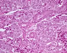 Both patterns have basaloid cells arranged in solid nests, nodules or trabecula, with focal peripheral palisading. The nuclei are round to oval with delicate chromatin and a usually single nucleolus. Ductules can sometimes be seen. The background stroma is loose, immature and sometimes myxoid. Necrosis can be present. Mitotic figures are often easy to find.[2][5][8][9] Tumor cells can be tested by immunohistochemistry which shows: Ductal cells: positive with keratins, CK7 and CK19. Basaloid or myoepithelial cells: positive with S100 protein, muscle specific actin, calponin and p63.[2][5][8] The proliferation marker, Ki-67, may show increased labelling, and when it does, it is associated with an unfavorable outcome.[10]
