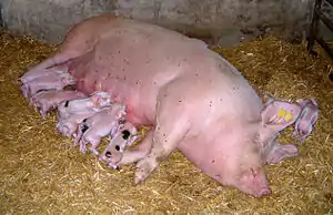 Domestic piglets (Sus scrofa) have been shown to exhibit different forms of non-lethal competition such as uterine competition. The relative development of the embryo in the uterus can affect their chance of survival. Pig embryos follow different developmental paths because during estrus, sows will ovulate the majority of their follicles during a short period of time and then a few during a longer period of time.[19] This pattern causes a difference in development, so the less developed embryos are less likely to survive. Competition also exists over space in the uterus of the sow. The central portion of the uterus is the most crowded and the site of the greatest competition. This competition prevents some embryos from fully growing, often resulting in a low birthweight that may put piglets at a disadvantage once out of the womb.[20] Neonatal competition also exists among piglets as they directly compete against their siblings for their mother's teats only hours after their birth.[21] Competition is responsible for 43% of piglet neonatal death due to starvation. Under normal conditions (i.e. stable environment, average litter size), larger piglets appear to have an advantage in survival partially due to their ability to win more fights against smaller piglets over access to teats.[22] It is believed that teeth in piglets evolved as a product of an evolutionary arms race caused by sibling competition, resulting in armed sibling rivalry. Teeth become more important when the litter size is larger than normal, causing increased competition. In these situations, the teeth can help the individual piglet compete against siblings.[23]