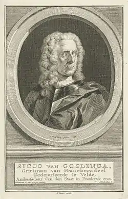 Sicco van Goslinga (Herbaijum, Friesland, 1664—Dongjum, 12 October 1731) was a Dutch statesman and diplomat, who served as gedeputeerde te velde (deputy-in-the-field, a kind of political commissar) of the States-General of the Dutch Republic with John Churchill, 1st Duke of Marlborough during his campaigns in Flanders in the War of the Spanish Succession. His memoirs form an important source of information for historians of the period.