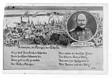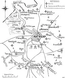 As part of the war planning conducted by Schlieffen and then Moltke between 1898 and 1914, a plan had been made to isolate Antwerp, to counter the possibility that Belgian forces reinforced by British troops, would threaten the northern flank of the German armies involved in the invasion of France.[12] The plan anticipated operations by eleven divisions from seven reserve corps on the east of the National Redoubt, where inundations were impossible. In 1914 the siege was conducted by only six divisions, one of which was needed to guard the Liège–Brussels railway between Tienen and Brussels and the ground between Brussels and Antwerp. Beseler abandoned the pre-war plan and substituted an attack from south of Antwerp, towards Forts Walem, Sint-Katelijne-Waver and then an exploitation northwards in the area of Forts Koningshooikt, Lier, Kessel, four intermediate works, the river Nete and an inundation 400–500 yd (370–460 m) wide. The 6th and 5th Reserve, Marine and 4th Ersatz divisions forced Belgian outposts back 4–5 mi (6.4–8.0 km) on 28 September and formed a covering line from the Nete to the Scheldt at Mechelen. Behind the covering line, German siege artillery was installed to the east and south of Mechelen, ready to commence a bombardment on Forts Sint-Katelijne-Waver and Walem as the Dorpveld and Bosbeek redoubts, to the north-east of Sint-Katelijne-Waver were engaged by 8 in (200 mm) mortars and the field defences between the forts, the Nete bridges and Antwerp waterworks north of Walem were bombarded by other heavy guns.[13][lower-alpha 2]