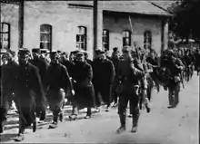 Edmonds wrote that it had been a mistake to assume that second line troops were sufficient to hold fortifications and that the effect on recruits and over-aged reservists of being subjected to heavy artillery-fire, which destroyed "impregnable" defences as the field forces retreated to safety, had a deleterious effect on morale, which could only be resisted by first-class troops.[47] A large amount of ammunition and many of the 2,500 guns at Antwerp were captured intact by the Germans.[48] The c. 80,000 surviving men of the Belgian field army escaped westwards, with most of the Royal Naval Division.[49] The British lost 57 killed, 138 wounded, 1,479 interned and 936 taken prisoner.[50][51]