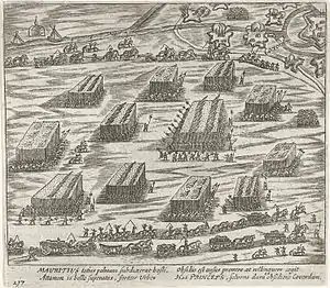 The siege of Coevorden was a thirty-one-week siege of the city of Coevorden in the province of Drenthe by the Spanish general Francisco Verdugo during the Eighty Years' War and the Anglo–Spanish War. The siege first commenced in October 1593, but winter and shortages of food and supplies forced the Spanish into winter quarters.[5][6] The siege however recommenced in March 1594, but on May 6 Maurice of Orange arrived with an Anglo-Dutch army to relieve Coevorden, forcing the Spanish army under Francisco Verdugo to retreat.[7]