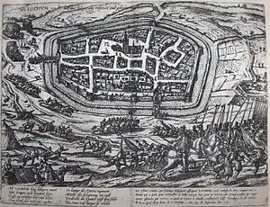 The siege of Lochem also known as the Relief of Lochem was a siege that took place in the Dutch city of Lochem during the Eighty Years' War and the Anglo–Spanish War. The city was relieved by a States army composing of English and French Huguenot troops under Count Philip of Hohenlohe-Neuenstein and William Louis of Nassau-Dillenburg and John Norreys on September 24, 1582.[5] This marked the end of the Spanish siege of the city by the Spanish general Francisco Verdugo.[1][6]
