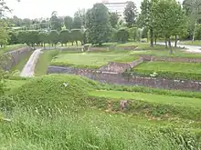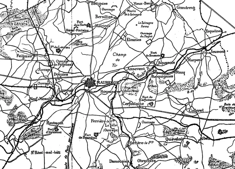After the Franco-Prussian War of 1870–1871 the French built more fortresses on the German border and extended the frontier fortifications northwards with new building at Hirson, Maubeuge, Lille and Dunkirk.[1] Raymond Adolphe Séré de Rivières oversaw the creation of a ring fortress, le camp retranché de Maubeuge (the Entrenched Camp of Maubeuge) with the construction of six forts and seven intermediate fortifications (ouvrages, fortified shelters).[2] The town walls, 500–600 m (550–660 yd) in diameter, had been built by Marshal Sébastien de Vauban in the seventeenth century. Forts de Boussois, des Sarts, de Leveau, d'Hautmont, du Bourdiau and Fort de Cerfontaine were built about 3–6 km (1.9–3.7 mi) beyond the city walls, on a circumference of about 32 km (20 mi). The forts were pre-1885 masonry types except for du Bourdiau, which had a concrete shell, capable of resisting some modern heavy artillery.[3]