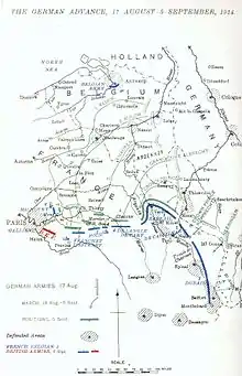 On 7 August 1914, Fournier had warned the Minister of War Adolphe Messimy of the lamentable state of the Maubeuge defences and was sacked the next day before General Paul Pau from Grand Quartier Général (GQG, general headquarters) with General George Desaleux and an engineer colonel, had been able to report on the situation. Pau vindicated Fournier, who was reinstated but the confidence of the civilians and the garrison was affected.[3][5] After enjoying a trade boom created by the arrival of army reservists, the morale of civilians in Maubeuge slumped further when they heard of German atrocities from Belgian refugees. On 15 August, gunfire was heard from the Meuse valley to the east and that evening news of the Battle of Dinant (15–24 August) was followed by reports of a counter-attack by the French 1st Army Corps.[3] On 12 August, Field Marshal Lord Kitchener had predicted a German offensive through Belgium but sent the British Expeditionary Force (BEF) to Maubeuge as planned.[6] The BEF landed in France from 14 to 17 August and assembled from Maubeuge to Le Cateau by 20 August.[7]