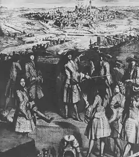 Louis, accompanied by members of his court, joined his army in the Spanish Netherlands to take control of the armies in theatre, arriving at the front on 21 March. The King's besieging army of 46,000 (under the direction of his great engineer, Vauban) surrounded the town and its garrison of some 4,800 men. The Allies had formed an army of 38,000 under William to relieve the city, but Luxembourg's army of observation, also 46,000 strong, denied the Allies any possibility of disrupting the operation.[8]