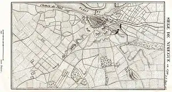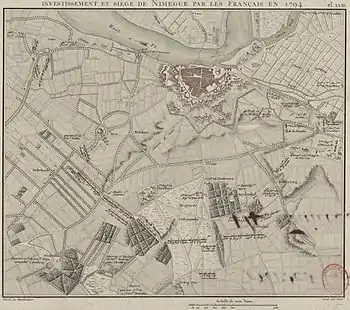 The Nijmegian contemporary citizen Jan van Hulst recorded a detailed account of the siege in his personal diary.[1] On 3 October, the States troops constructed a floating bridge across the river Waal near Nijmegen for easier troop movement. Those days, companies from several countries came and went from the city, and the stadtholder and his sons showed up several times inside its walls. The French came closer by the day, and there were multiple minor field battles and skirmishes near the outposts to the south of Nijmegen, while the city and the surrounding forts were being reinforced.[1] The French Armée du Nord led by general Jean-Charles Pichegru, assisted by the Batavian Legion under the Patriot brigadier generals Herman Willem Daendels and Jan Willem de Winter. They forced the Orangist troops to surrender 's-Hertogenbosch on 12 October after a siege of three weeks.[6]