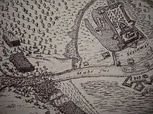 ![]() Novi Zrin Castle, situated on the right bank of the Mura River (Muhr flus), in 1664, before its ruination | |||||||