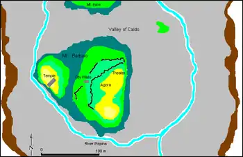 The city of Segesta is built around twin peaks of Mt. Barbaro, respectively 415 and 433 meters in height. The mountain itself sits in the middle of an elevated valley, while the deep gorges of River Pispina form a natural moat on three sides of the hill. The city itself was walled, parts of which is still visible today. The walls initially may have covered both peaks, but at a later date were rebuilt only around the city proper.