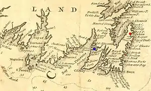 ![]() Extract of a 1744 map showing southeastern Newfoundland. Plaisance is marked in blue, St. John's and smaller English settlements are marked in red. | |||||||