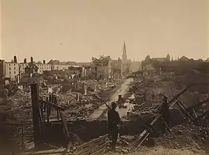 The French lost 17,562 troops, 1,277 artillery pieces, 140,000 rifles, including 12,000 Chassepots, 50 locomotives and their supplies captured.[21] The French National Guards were dispersed.[21] The Germans lost 936 officers and men, including 177 killed and died of wounds, 715 wounded and 44 missing. Horse losses were 78, of which 37 killed or died of wounds, 29 wounded and 12 missing.[7] Some 861 French soldiers died from all causes by the end of the siege.[22] The German General Staff estimated 2,500 French combatants killed or wounded.[18] A total of 341 civilians were killed by the bombardment and a further 600–2,000 wounded.[23] An estimated 448 houses were completely destroyed and 10,000 inhabitants, including refugees, were rendered homeless.[18][21] The German government compensated three quarters of the costs of the siege and occupation to the city.[19]
