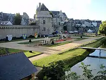 From 1365, under the authority of Duke John IV, Vannes began to prosper again. The scars of the past war however were still very present in the townscape. The Duke decided to rebuild the destroyed walls, to repair the gates and to enlarge the town wall.[7] The enclosed town area was enlarged towards the south as far as the port, so that the area within the walls was doubled by it. Wanting to profit from the more central situation of the town in his Duchy (compared to the towns of Rennes or Nantes), he also constructed his new ducal residence there – the castle of l'Hermine. In 1379, after the return from exile of the Duke, Vannes became the seat of ducal power for several decades.