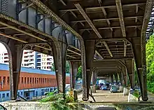 Leaving the station in a western direction, the line passed under the westbound Ringbahn track and diverged north to cross the river Spree and continue onto an elevated alignment that is part steel viaduct, part on an embankment interspersed with steel or concrete road bridges.