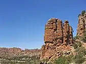 Sierra de Órganos is nestled within the Sierra Madre Occidental mountain range, in an area that corresponds to the physiographic province of the Mexican Plateau. The topography is uneven, with elevations ranging from 2,120 to 2,560 metres (6,960 to 8,400 ft) above sea level.[1] This gives rise to dramatic ridges and steep peaks that form small plateaus, often with very prominent, nearly vertical cliff faces. Small valleys surrounding the peaks afford scenic views of the rock formations from below.[5]