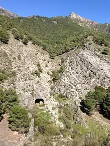 The early hominids in the region would have moved from caves on the coast to caves in the Sierra de Tejeda on a seasonal basis. The 40,000 year old bones of a Neanderthal man have been found in the Boquete de Zafarraya cave in Alcaucín, in a spur of the Sierra de Alhama just west of the Sierra de Tejeda.[5] Canillas de Aceituno is at the foot of the Sierra, at an altitude of 649 metres (2,129 ft), in the region between the marbles of the Sierra de Tejeda and the schist land lower down in the slopes of the Almanchares river basin. The Fajara cave was used in the Neolithic era, and the Rábita cave shows evidence of iron ore extraction in Roman times.[19] Three bridges on the slopes of the sierra in the towns of Sedella, Salares and Canillas de Albaida are said to have a Roman origin, although their appearance today is medieval.[15]