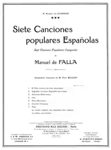 Siete canciones populares españolas ("Seven Spanish Folksongs") is a 1914 set of traditional Spanish songs arranged for soprano and piano by the composer Manuel de Falla. Besides being Falla's most-arranged composition and one of his most popular, it is one of the most frequently performed sets of Spanish-language art songs. The set was dedicated to Madame Ida Godebska.[1]