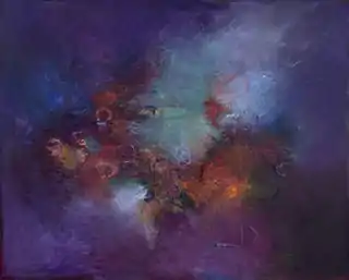 In the 2010s, Burton's paintings have been increasingly informed by her own astronomical observations at observatories in Pasadena and Chile, as well as longstanding natural, calligraphic, Hindu and Jain motifs.[37][38][39] These paintings are more abstract than previous work, with greater depth of field and dense layering; reviews characterize them by their acrobatic visual play between rich, mysterious color fields and loose, unfettered mark-making, whose elements suggest responses to natural phenomena and personal experience rather than representations, as in Asterisms (above), Storm Heart or The Angle of a Landscape (all 2019).[6][3][39] Writing about the work (from 2015–9) in Burton's 2020 show at Tufenkian Gallery, critic and curator Michael Duncan describes Burton as exploring "paint’s ideal potential in an unapologetic pursuit of the sublime," part of a neglected underground of colorists using "color as a vehicle to the ineffable."[39]