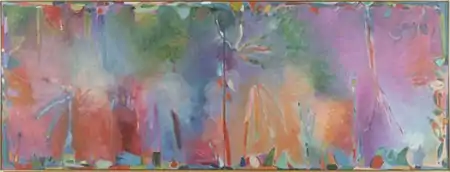 After an extended stay in India in 1995, during a time of personal loss as well as the AIDS crisis, Burton again re-evaluated her art and its ability to express the totality of experience.[4] She emerged with darker, brooding works (frequently in reds and deep crimsons, such as The Waters of March, 1999) more rooted to everyday experience and memory, and rich in natural and multicultural allusions that appeared and dispersed amid hazy, color-saturated surfaces.[7][5] Often, this work used implicit grids and loosely constructed, imagined or canonical Indian color systems as a starting point.[13] Critics described her approach as intentional yet ambiguous,[4] and mysterious with a "calculated inexactitude" that obscured distinctions between figure and ground, plant and animal.[7] In 1999, Peter Frank observed, "form asserts itself in the midst of her luminous, translucent clouds of color, giving unanticipated backbone to otherwise invertebrate masses of hue and tone."[7] William Agee noted how Burton's expansive, atmospheric spaces are "brought back to earth by passages of drawing" that allude to quotidian life and world culture; he compared her fusion of these pictorial opposites to that of Matisse.[4]