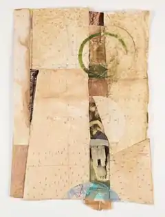 While best known for her painting, Burton has throughout her career created mixed-media works on paper that recall Kurt Schwitters and Paul Klee and use pencils, pastels, oil sticks and collage.[24][40][41] Her later works on paper, such as Maroc (2013–6), repurpose old drawings and accumulated ephemera from Burton's travels and from scrapbooks of her grandparents; the choice of collaged material is often intentionally but cryptically biographical or autobiographical.[13][42] These later drawings explore a deeper sense of space and figure-ground ambiguity which has crossed over to her paintings.[13]