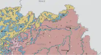Placer gold is mined here.[4] North and northwest of Siguiri, and along the Tinkisso River, is the Bouré region. This region replaced Bambouk as a major gold producer in the 11th-12th centuries. Gold is also found along the Sankarani River.[5][6][7]
